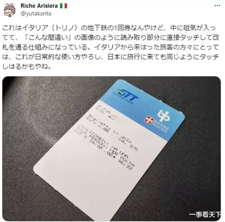 「我珍藏大利(齐灵)坐地铁时,使用的纸质票依靠里面的磁条过闸机。是以,从意大利来到日本的搭客,可能会把‘扫纸票’动作理所虽然。」