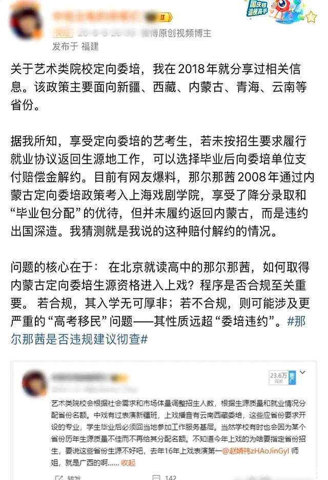 肤浅捋一下时间线:2008年,那尔那茜通过内蒙古的定向委培战略考上了上戏,这相等于开了个“绿色通谈”,降分登科,毕业还“包分派”。