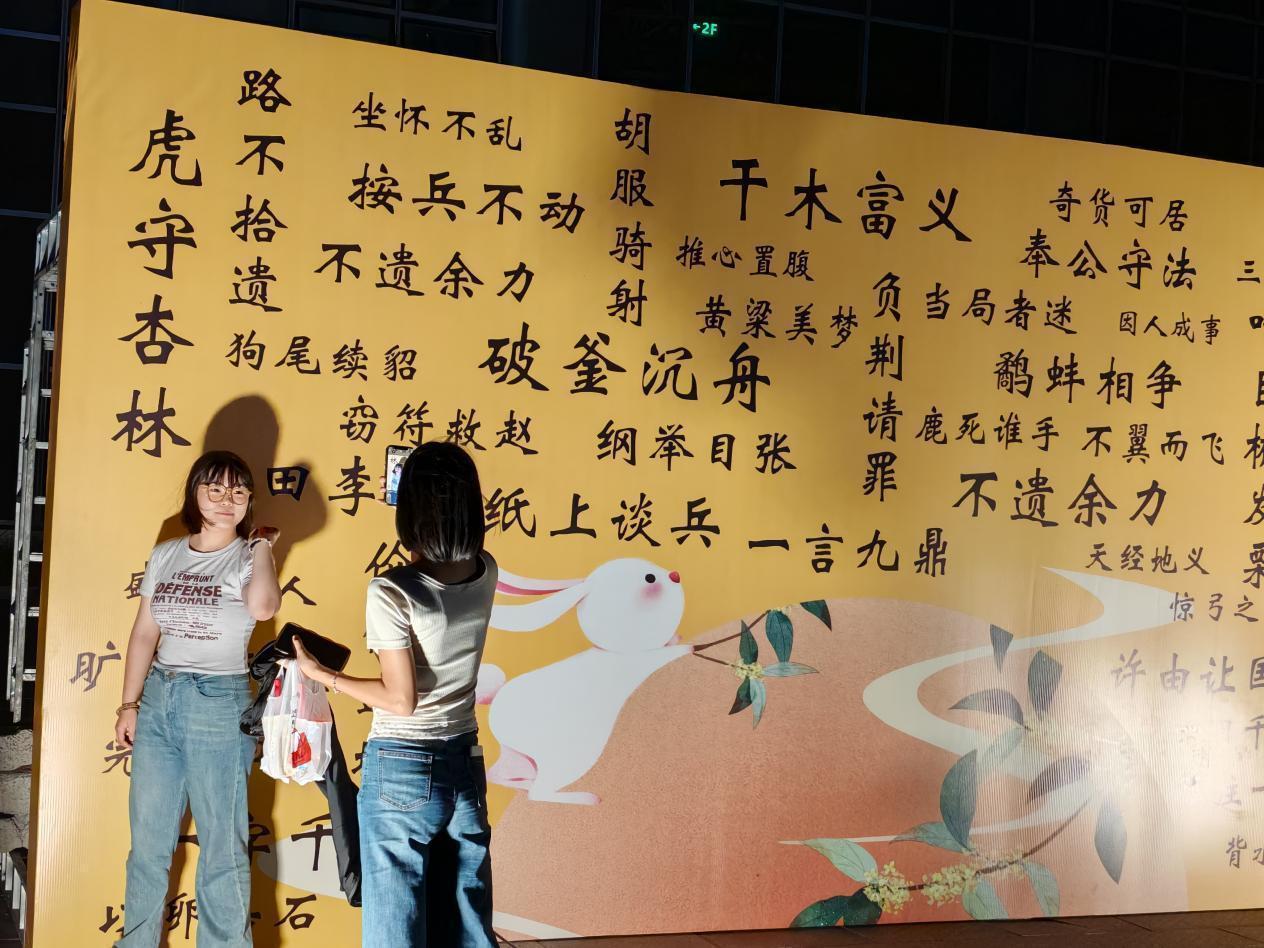 邱县在鲲鹏国外会展中心广场举办优选市集,旅客在谚语墙前打卡拍照。李文娟摄