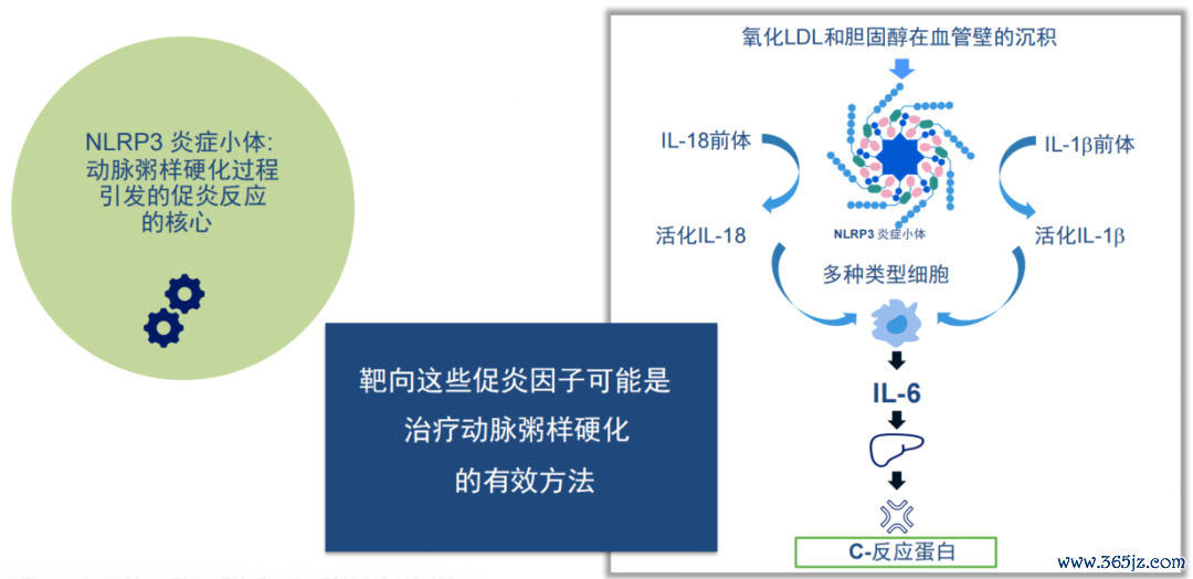在谈到若何识别ASCVD患者的残余炎症风险时,Florian Kahles教会暗意现在合计NLRP3炎症小体在致AS中起到了蹙迫作用。NLRP3炎症小体是一种由多个卵白构成的复合物,激活后促进IL-1β及白细胞介素-18(IL-18)的产生和开释。这些细胞因子会刺激多样炎症细胞并产生IL-6,从而导致肝脏产生C反应卵白(CRP)[13]。如图3所示。