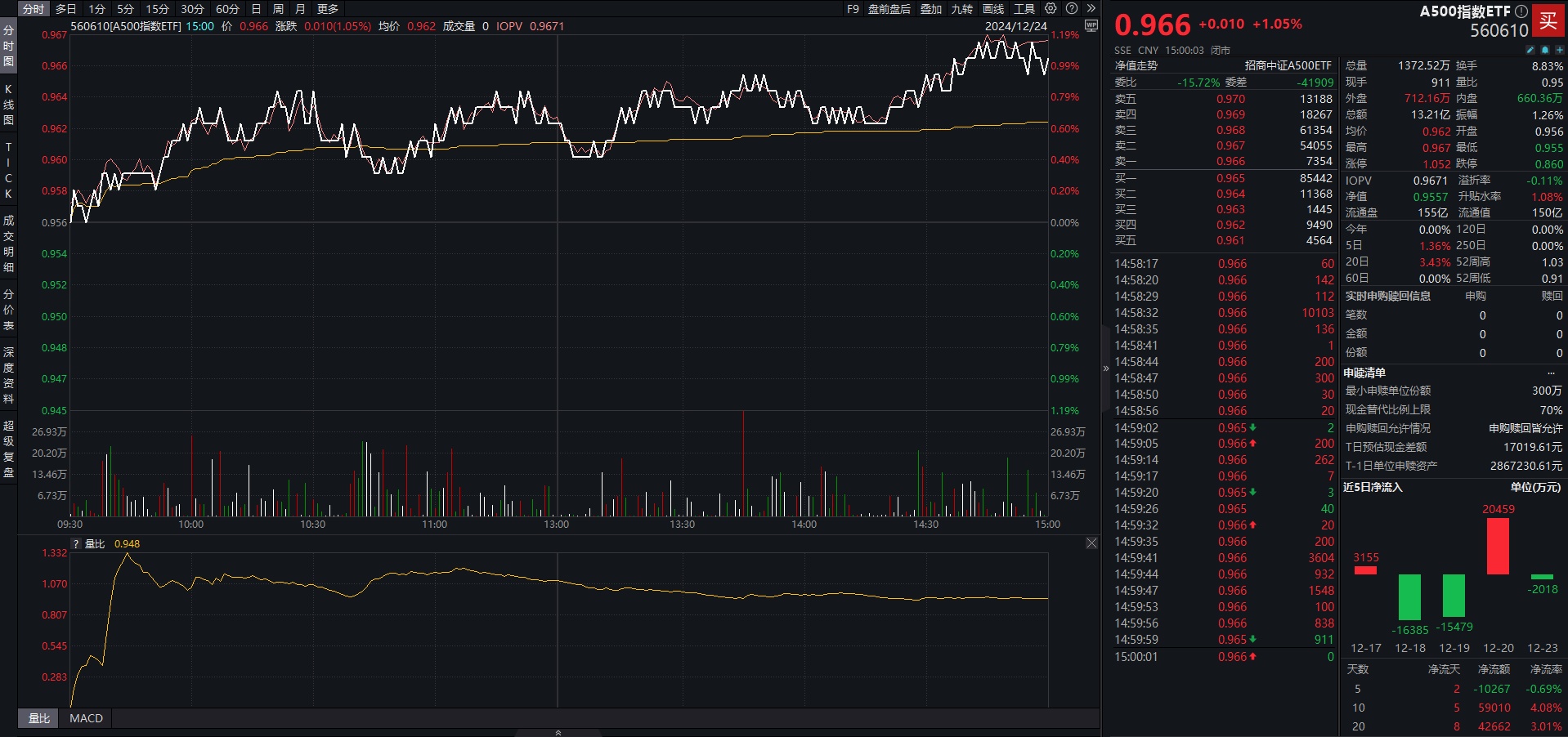 A500指数ETF(560610)昨日涨1.05%,交投活跃。具体来看,换手率8.83%,全天成交额超13亿元,为衔接43个往返日成交额超10亿元。身分股方面,四川长虹、新产业涨超8%,欧普康视、波澜信息、三环集团等多股涨超5%。