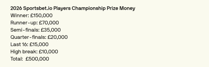 斯诺克球员锦标赛是又一项红包赛,过问就最少成绩1.5万英镑。邀请单赛季名次前16的选手过问,国手五东说念主出战,具体是:赵心童,吴宜泽,肖国栋,周跃龙,张安达。 奖金分派情况细则如下图。 冠军15万英镑。 亚军7万英镑。 四强3.5万英镑。 八强2万英镑。 16强1.5万英镑。 单杆最高分奖金1万英镑。 首轮赛程安排细则如下图。 2.17晚上九点,吴宜泽VS马克艾伦。 2.18凌晨三点,肖国栋VS沃克林。 2.18晚上九点,周跃龙VS特鲁姆普。 2.18晚上九点,张安达VS肖恩墨菲。 2.19