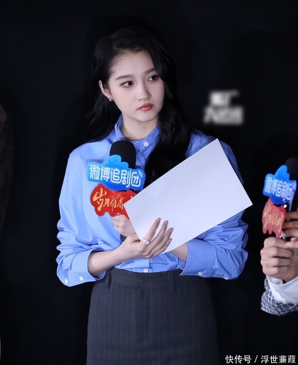 她当日遴荐浅蓝色棉质衬衫叠搭深灰细条纹A字短裙,举座造型从简却不失芳华律动,与剧中林小雨一角的青涩朝气高度契合,细节处尽显经心。