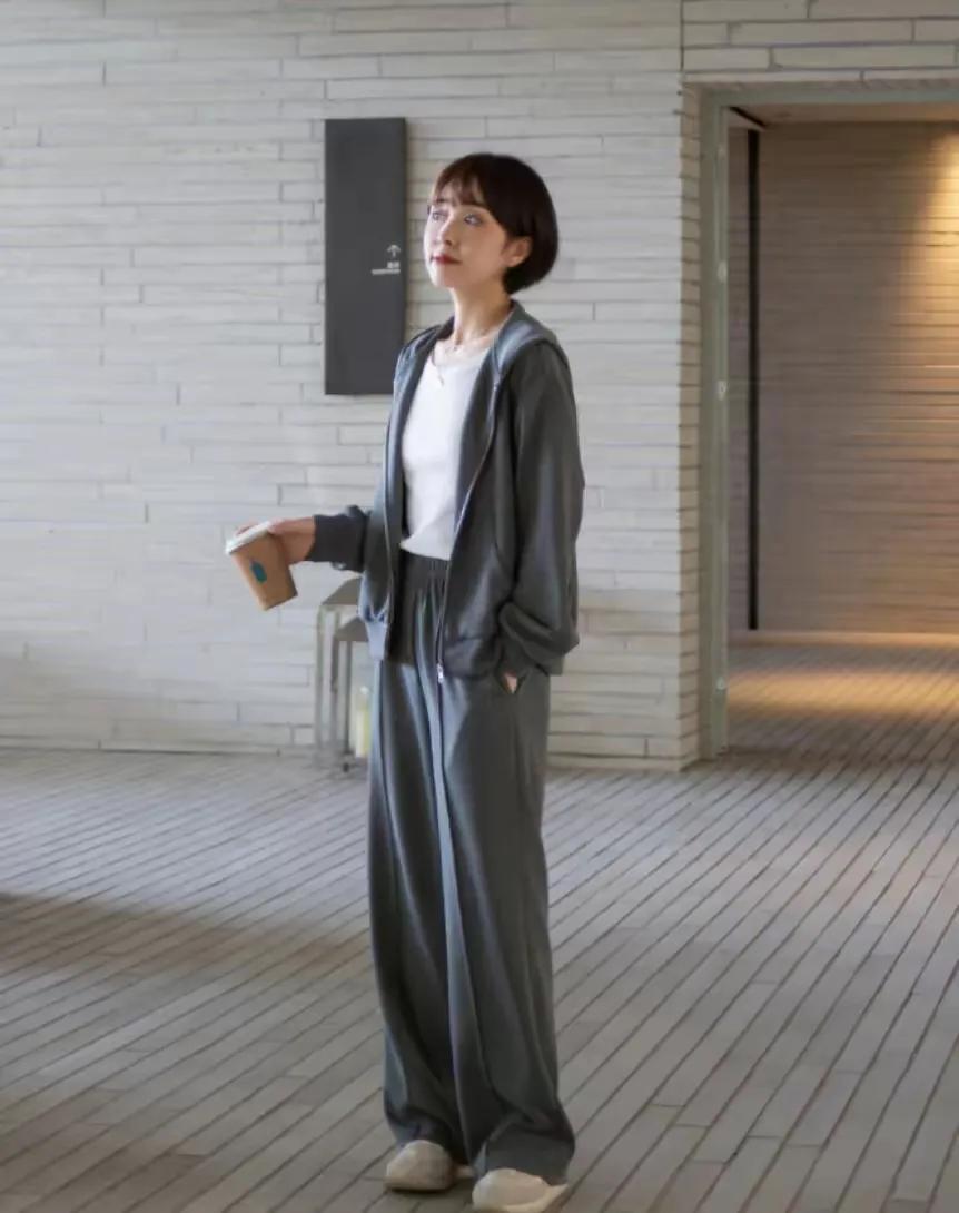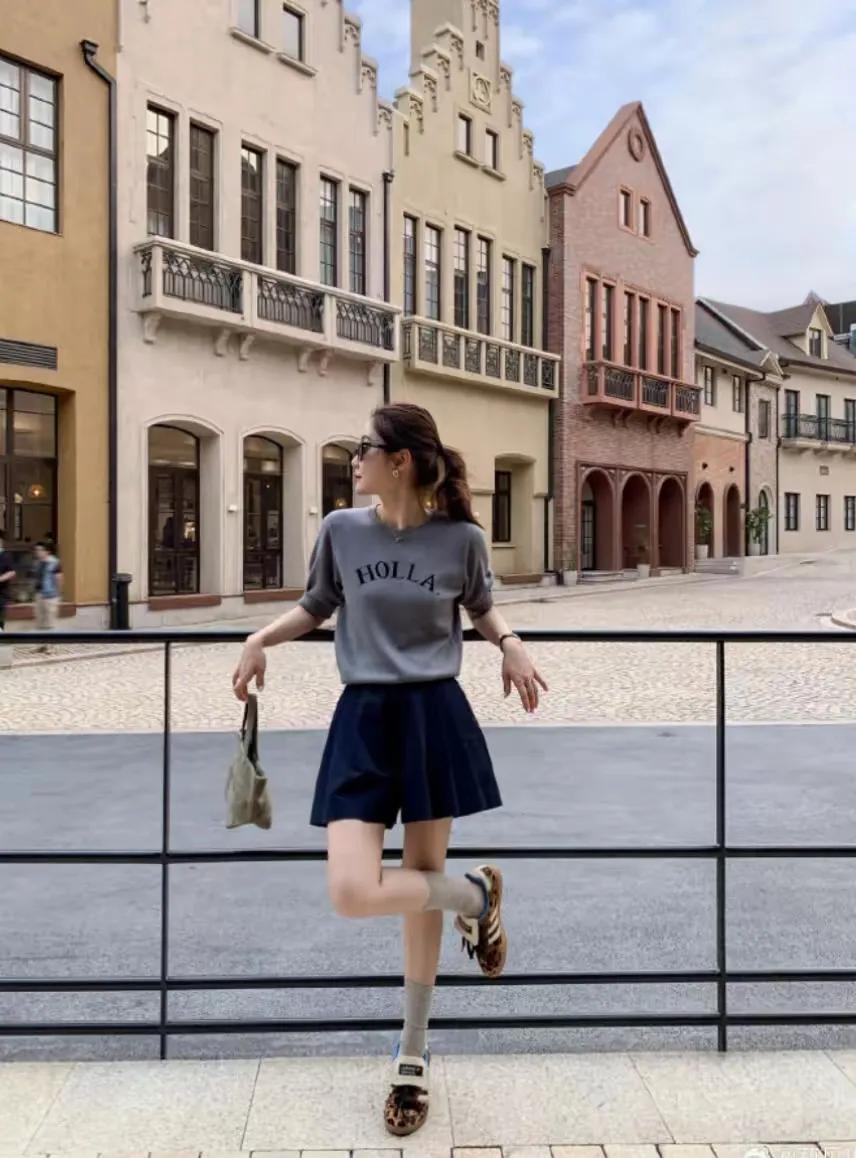 我们接着再来看底下这位达东说念主的穿搭时势,灰色的上衣搭配上藏蓝色的百慕大短裤,脚上穿了一对德训鞋,在家的一款马尾辫发型