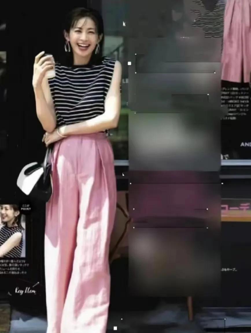 淌若你思要我方的穿衣配色,更个性的情况下,可以学习底下这么的穿搭要道,用条纹的无袖上衣搭配上粉色的阔腿裤,这么的穿搭时势相比偏日系风