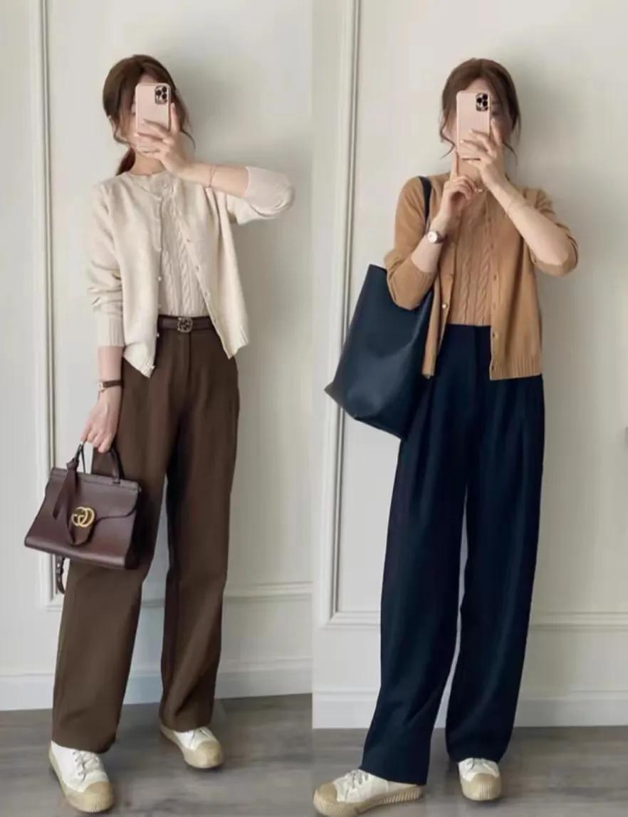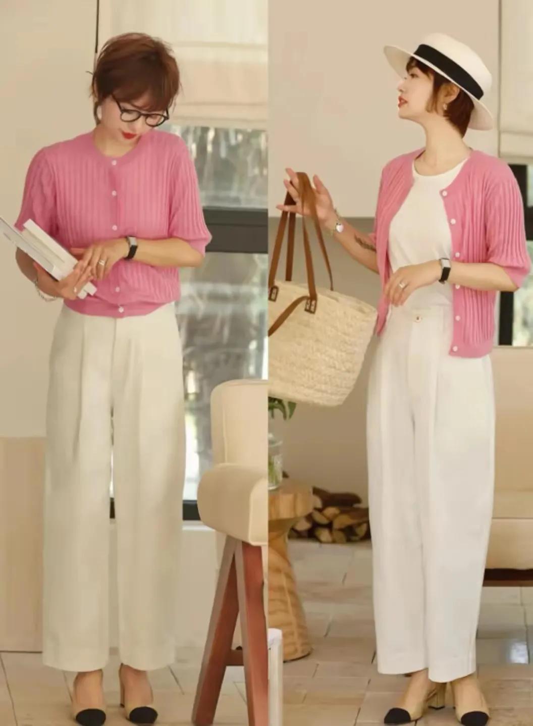 淌若思要优雅感的情况下,个东说念主更推选人人聘请羊皮材质八成是牛皮材质的浅口单鞋,举例底下这一对黑白拼接的粗跟单鞋,搭配上白色的西装阔腿裤和粉色的真挚开衫,这么的穿搭造型就优雅多礼,况兼显得干练,更顺应中年女性穿搭。