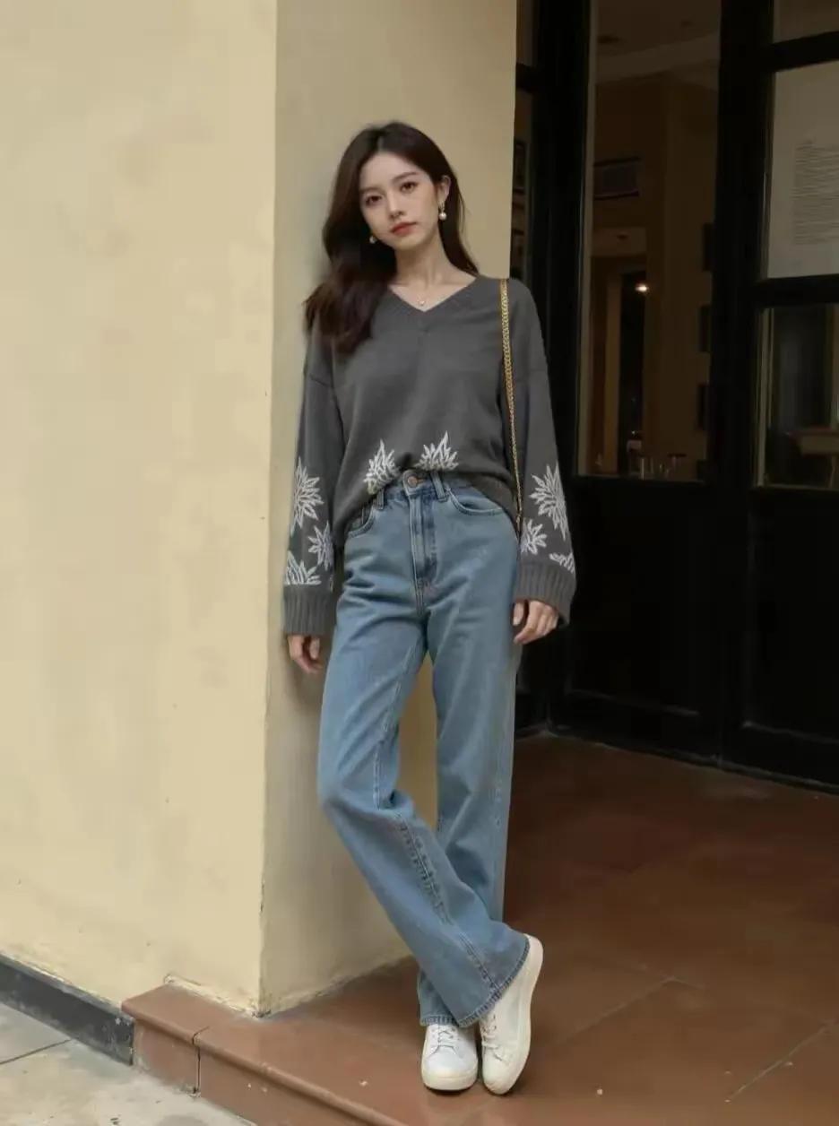 思要总共造型更有先锋感的情况下,我们可以学习底下这位达东说念主的穿搭时势,告成聘请一件V领的真挚上衣,搭配上牛仔直筒裤,脚上踩了一对小白鞋