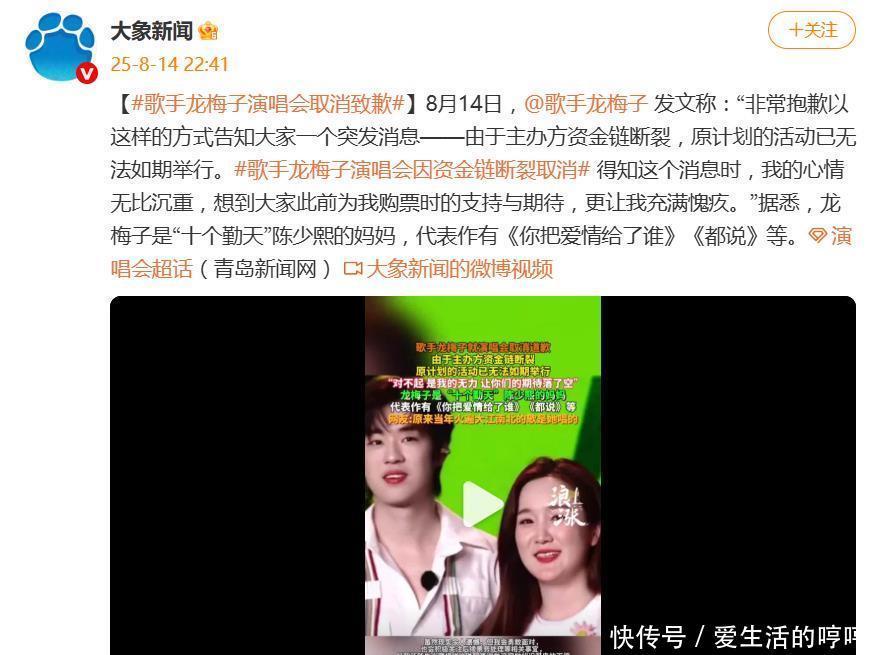 龙梅子在直播中屡次呜咽谈歉,直言“最爱重粉丝的期待破灭和经济赔本”。动作“十个勤天”成员陈少熙的姆妈,她一向以接地气的形象深受喜爱,代表作《你把爱情给了谁》《齐说》传唱度极高。此次演唱会本是回馈家乡粉丝的丹心之作,却因主理方的“骚操作”形成了一场闹剧。