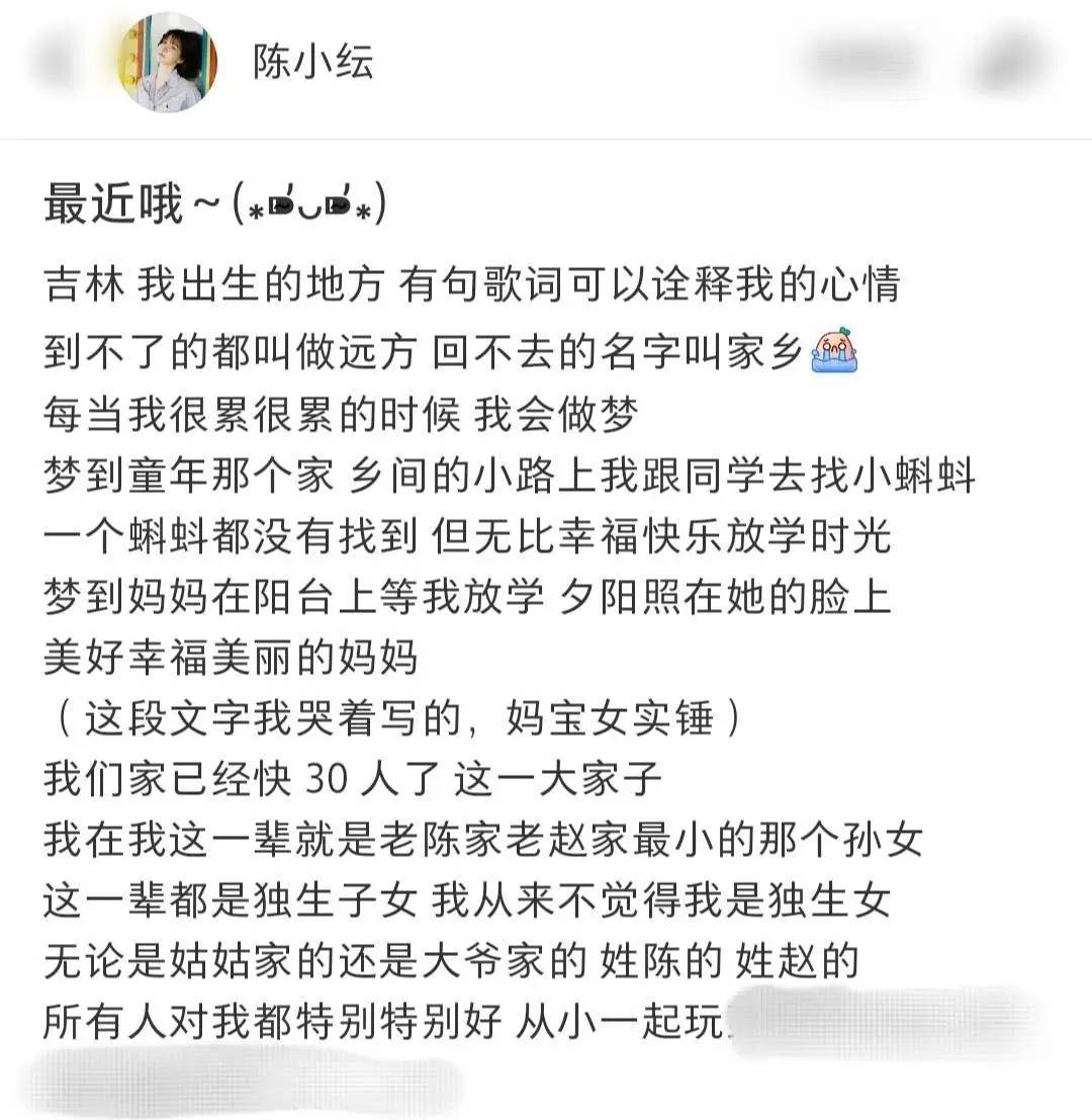 陈小纭故乡在吉林的具体场所没说,但提到过是普通家庭。姆妈作念啥责任的没提,姥姥算计年岁快八十了。有博主分析她发故乡视频可能为了拉近和不雅众距离,但她说的等于念念回家望望。