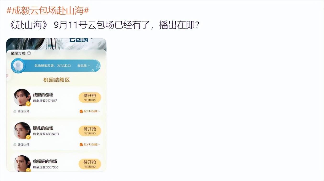 列位读者,你们最期待哪部剧开播呢?近日,网上再次传出,《赴山海》将定档开播的音讯,随后,关系话题陡然登上热搜体育游戏app平台,网友们相配期待《赴山海》,然则在原谅《赴山海》的时期,没思到又出现一个问题,成毅果真要“单扛”吗? 本年暑期如故由去,暑期档刚到来的时期,网上曾传出音讯,《赴山海》将和《凡东谈主修仙传》对打,然则《凡东谈主修仙传》早就迎来大结局,《赴山海》却迟迟莫得播出,当寰球王人在期待这部剧的时期,网友们发现《赴山海》的云包场如故出现,意味着这部剧有望11日开播。 《赴山海》是成毅