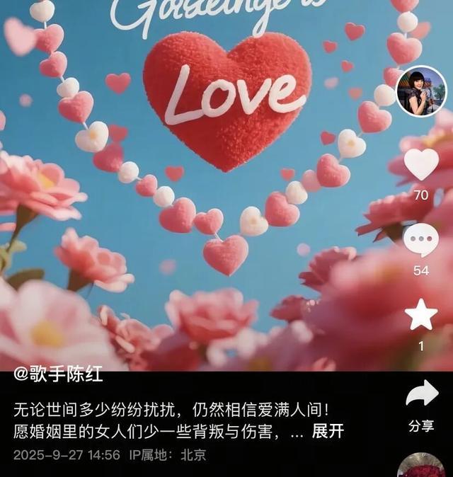 9月27日,陈红在抖音账号发文称,“不管世间些许纷侵略扰,仍然肯定爱满东谈主间!愿婚配里的女东谈主们少一些反水与伤害,愿男东谈主多一些背负与担当,常回家望望!”