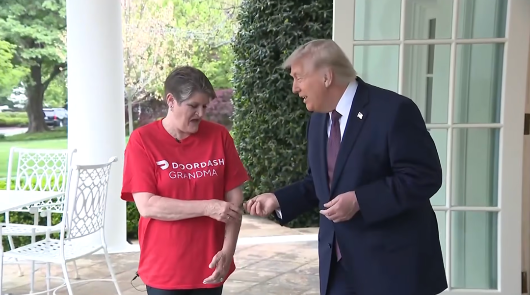 一稔印有“DoorDash Grandma”(送餐奶奶)红色T恤的Simmons告诉川普,这份订单里包含“您的最爱”。