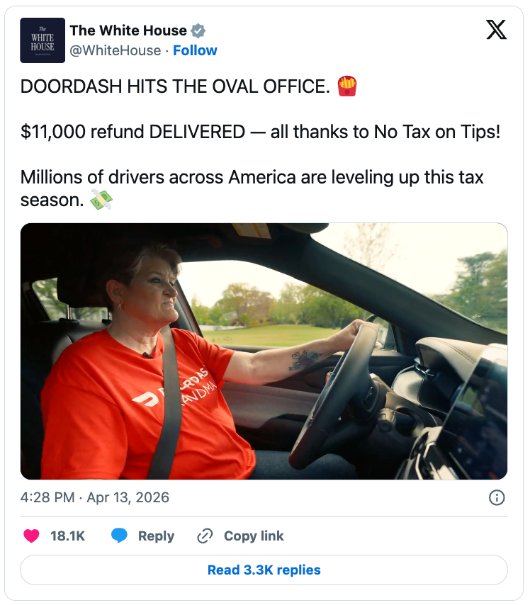 周一,白宫在外交媒体平台X上发帖称,来自阿肯色州的Simmons是一位领有10个孙辈的祖母,她昨年通过小费赚取了1.1万好意思元,并用于救济家庭生存。她于2022年加入DoorDash,该公司暗示,自当时起于今,她已完成了卓越14,000单配送。