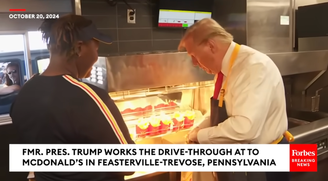 在2024年竞选时期,川普曾在宾夕法尼亚州Feasterville-Trevose一家麦当劳的免下车(drive-thru)窗口,良晌体验了快餐伴计工的职责。