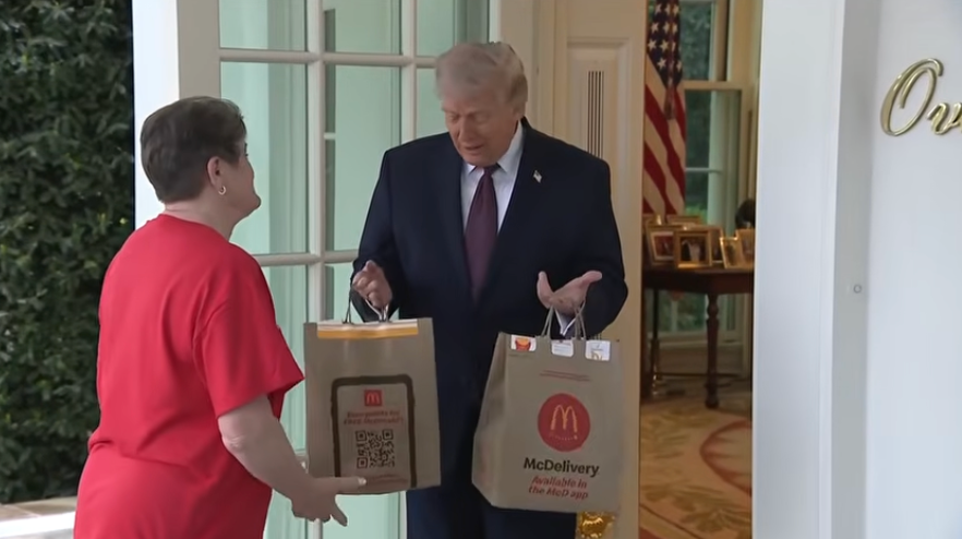 白宫称,这次送来的外卖袋中装满了芝士汉堡和薯条,并称这些食品随后由川普切身转交给白宫西翼的职责主说念主员共享。