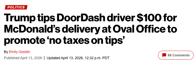 蓝本,这份麦当劳订单旨在宣传川普政府鼓动的“小费免税”战略,此举距离大多半好意思国东说念主2025税务年度的报税畛域日历(4月15日)仅剩两天。