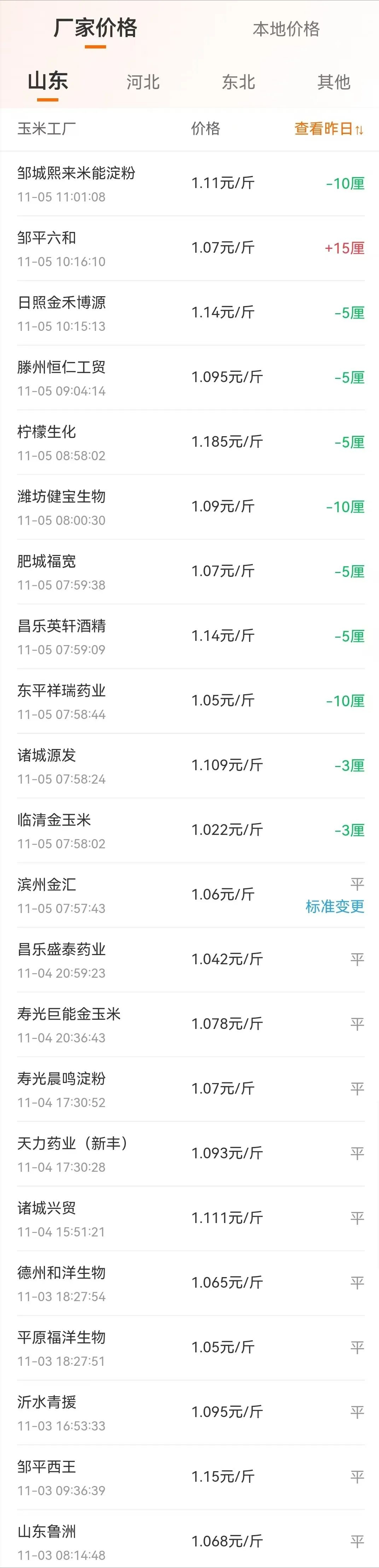 其中,在山东地区,深加工挂牌均价在1.086元/斤,在深加工报价方面,邹城熙来下降1分,报价在1.11元;日照金禾博源下降0.5分,报价在1.14元;枣庄恒仁工贸下降0.5分,报价在1.095元;柠檬生化下降0.5分,报价在1.185元/斤;潍坊健宝生物下降1分,报价在1.09元;肥城福宽下降0.5分,报价在1.07元;昌乐英轩下降0.5分,报价在1.14元;东平吉利下降1分,报价在1.05元;诸城源发下降0.3分,报价在1.109元;临清金玉米下降0.3分,报价在1.022元/斤!山东主流深加工玉米挂牌均价在1.05~1.185元/斤傍边!