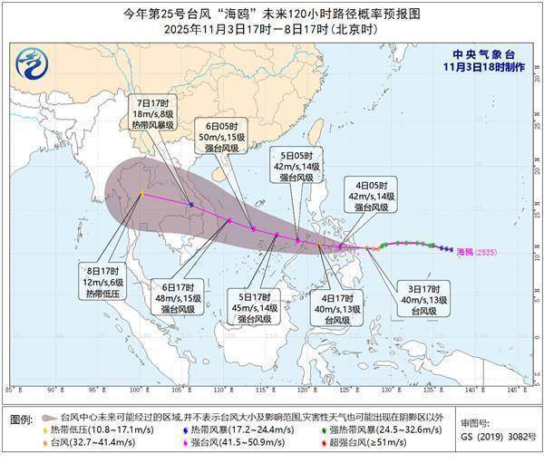 本年第25号台风“海鸥”仍在发展中,今天夜间到未来凌晨登陆菲律宾中部沿海(台风级或强台风级,40—45米/秒,13—14级),以后穿过菲律宾中部,将于5日清晨移入南海东南部海面,强度将赓续加强,最强可达强台风级(45—50米/秒,14—15级),6昼夜间逐渐趋向于越南中部沿海。