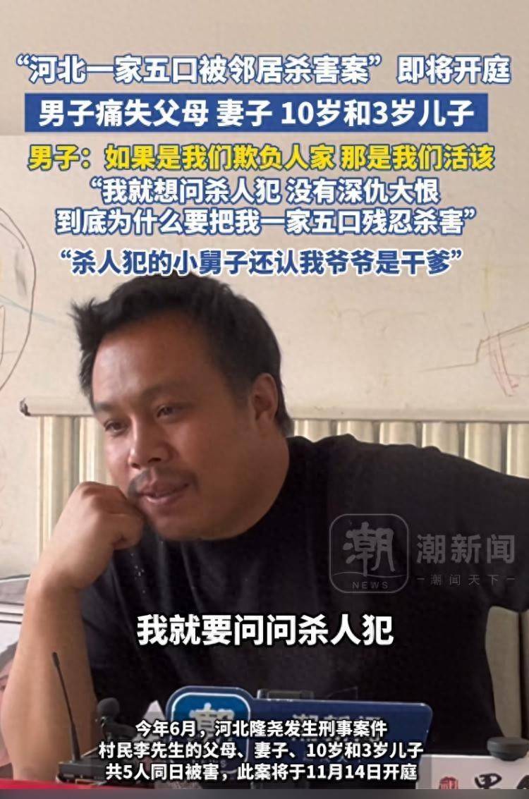 11月13日,潮新闻记者来到案发地隆尧县北寺庄村。被害东谈主家属李先生在罗致潮新闻采访时暗意,其于今未能罗致五位亲东谈主被杀害的事情,“每天昏头昏脑,我齐不知谈若何扛到今天的。我深信法律不会放过一个坏东谈主,也不会冤枉一个好东谈主。”