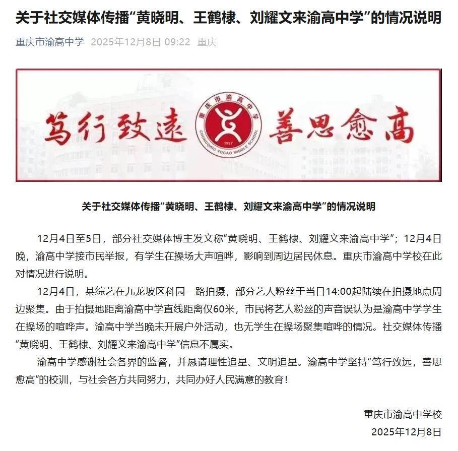 近日,因为一批艺东谈主粉丝在学校邻近行动,重庆一所高中的在校学生疾苦背上了一口“扰民”的大锅。12月8日,重庆市渝高中学校发布情况说明,通报了这起事件的世代相承:12月4日晚欧洲杯体育,学校接市民举报,称有学生在操场高声喧哗,影响到邻近住户休息。然则学校打听发现,当日晚间学校并无户外行动,学生也未在操场采集喧哗。给隔壁市民形成困扰的,其实是当晚在学校隔壁拍摄综艺节目时采集的部分艺东谈主粉丝。 校方情况说明全文 从网传信息来看,今日参与综艺录制的,有黄晓明、王鹤棣、刘耀文等多位驰名艺东谈主,可谓